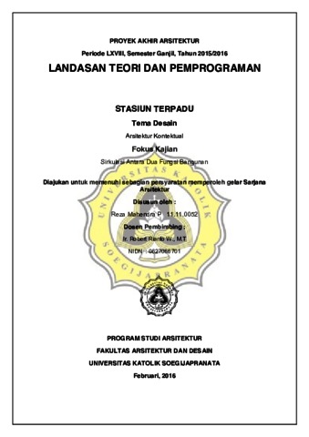 Mahendra P, Reza (2016) LANDASAN TEORI DAN PEMPROGRAMAN STASIUN TERPADU Tema Desain Arsitektur Kontektual Fokus Kajian Sirkulasi Antara Dua Fungsi Bangunan. Other thesis, Fakultas Arsitektur dan Desain Unika Soegijapranata Semarang.