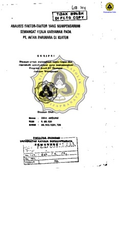 Ardiani, Diah (1995) ANALISIS FAKTOR-FAKTOR YANG MEMPENGARUHI SEMANGAT KERJA KARYAWAN PADA PT. INTAN PARIWARA. Other thesis, Prodi Manajemen Unika Soegijapranata.