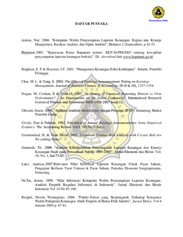 Penelitian ini menganalisis relasi antara risiko finansial dan risiko bisnis terhadap kecepatan waktu publikasi laporan keuangan. Tujuan dari penelitian ini adalah sebagai berikut: Pertama, untuk mengetahui apakah perusahaan yang memiliki risiko finansial rendah akan lebih awal memublikasikan laporan keuangan. Kedua, untuk mengetahui apakah terdapat perbedaan yang signifikan antara persentase jumlah perusahaan dengan risiko finansial rendah yang memublikasikan laporan keuangan di awal dengan perusahaan yang memublikasikan laporan keuangan di akhir. Ketiga, untuk mengetahui apakah perusahaan dengan risiko finansial tinggi akan memublikasikan laporan keuangan di akhir. Keempat, untuk mengetahui apakah terdapat perbedaan yang signifikan antara persentase jumlah perusahaan dengan risiko finansial tinggi yang memublikasikan laporan keuangan di awal dengan perusahaan yang memublikasikan laporan keuangan di akhir. Kelima, untuk mengetahui apakah perusahaan dengan risiko bisnis rendah akan lebih awal memublikasikan laporan keuangan. Keenam, untuk mengetahui apakah terdapat perbedaan yang signifikan antara perusahaan dengan risiko bisnis rendah yang memublikasikan laporan keuangan di awal dengan perusahaan yang memublikasikan di akhir. Ketujuh, untuk mengetahui apakah perusahaan dengan risiko bisnis tinggi akan lebih akhir memublikasikan laporan keuangan. Kedelapan, untuk mengetahui apakah terdapat perbedaan yang signifikan antara persentase jumlah perusahaan dengan risiko bisnis tinggi yang memublikasikan di awal dengan perusahaan yang memublikasikan di akhir.