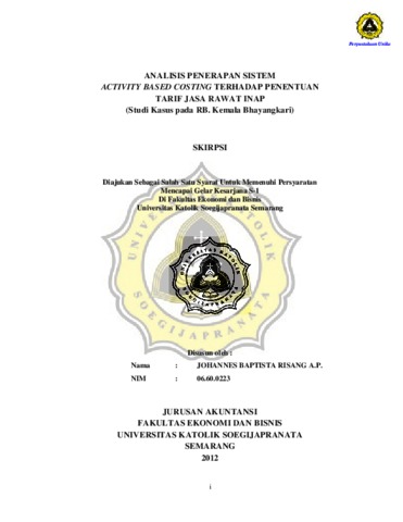RISANG, JOHANNES BAPTISTA (2012) ANALISIS PENERAPAN SISTEM ACTIVITY BASED COSTING TERHADAP PENENTUAN TARIF JASA RAWAT INAP (Studi Kasus pada RB. Kemala Bhayangkari). Other thesis, Prodi Akuntansi Unika Soegijapranata.