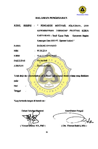 Tenaga keIja merupakan aset perusahaan yang paling penting dan menentukan efektivitas dan efisiensi perusahaan, hal ini dikarenakan tenaga kerjalah yang melaksanakan dan mengatur kegiatan perusahaan. Peranan tenaga kerja sangat besar bagi keberhasilan suatu usaha yaitu secara l;:tne"'ltle d~n ~ktif tp.rlihat nR1Rm jR1RnnyR ni"tribusi dan pemasaran sllatll prodllk. Maka nemsahaan hanJs menl?elola dan memnerha.tikan tenaga keria temlama dalam • .: • . . . • _ / . - . l ....... oJ ..• hal prestasi ke~ja. Pengukuran prestasi ke~ja ini dapat terlihat dari hasil ke~ia yang dilakukan karyawan. Secara khusus, prestasi ketja sangat ditentukan oleh inter<1ksi antaf'<1 rnotivas( pelatihan dan kepemimpinan yang berbeda-beda sehingga prestasi ke~ja yang diperoleh juga akan bervariasi. Oleh karena ketiga faktor tersebut rnak;; pt;n~liti tertarik untuk melakukan penelitian yang lebih dalam.Adapun judul penelitian ini pengaruh positif dan terhadap prestais ke~ia Definisi operasional dari pelatihan yaitil pCiiilu.iaii a:.r,ck [,ciigctahuaii du.ii penilaian aspek ketrampilan. Definisi operasional dari kepemimpinan yaitu kemampuan pimpinan dalam mengambil keputusan, obyektivitas pimpinan dalam memperlakukan karyawan, kemampuan pimpinan dalam menc":nrlibii P,II-,i'it,;, ,..-:;;" !..-,-,iiiiiiiik.;;;;i ';iit;;r;\ pimpinRn dan bawahan. Definisi operasional dari prestasi ke~ja yaitu kuaJitas ket:ja, kuantitas kerja, ketepatan dalam menggunakan waktu untuk melaksanakan tugas dan kecepatan dalam menggunakan waktu dalam melaksanakan tugas. Populasi dalam penelitian ini adalah karyawan PT. Djarum Kudus bagian keuangan dan HRD yang berjumlah 55 orang_ Mengingat jumlah ropula,sl yane sedikit, maka 55 orang karyawan tersebut dijadikan responden (sensus).