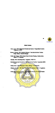 All" pelaksanaan ak1ivitas dalam perusahaan menjadi lebib mudab maka perencanaan hams dilengkapi sceduling (penjadwaian). daJam arti pembagian dan pembatasan waktu penyelesaian pelaksanaan aktivitas dalam perusabaan, Maka clapat eliperoleh gambaran umum lamanya waktu yang dipedukan unruk menyelesaikan suatu pekeljaan suatu prnduk secaI1l keseluruhan kepada -- .... langganan atau konswnen. Perusabaan mebel se'!:!Yl<'illi engbadapi pesonan pelanggan untuk benruk-benruk dan ut&lC1~an;;;;'aru, Apabila menggunakan diagrun network maka md'fmen akaD. mengalami kesulit= ~ menentukan kapan proses pemilm .. barony 8 dipesan d.~' sdesai" ,iWabila manajemen perusabaan meh)an)'7 " ak'tU yang ~8daharrli..\ seneli lum yakin .pakah pesan J~but, ~a, disele sosuai waktu '\,8 <h~ tersebut. Sebalikn ~p~"T.'erusahaan menjan)daui waktu yon, I';'" {(... ingin agar pada Uyang di~anjikan laSe !if b,jJg ~ siap 1 tul, dan 1 juga khawatir jangan-j b.n lan"anadIItoasimien te&6ut 1ari ko " ,.bian tbel lain yang dapat m ,I ' ~ya ~ I.bib """,,L '7 , D menghadap' ~s:-"perusabaan mebel T A lebib ~*::;:;-, / menekankan d keunggulan,plut\P,'-~erta pelayan epada konsumen. un penyelesaian pap kegiatan m akan keunggulan yang proses prnduksi yang ada diperusahaan terdiri dari berbagai tabap, Dalam ponyelesaian pembuatan kitchen set, standar waktu yang digunakan pemtahaan adalah 47 ,bari,tetapi apabila konsumen merninta waktu lebib cepat dari waktu normal., perusahaan mengalami kesulitan daJam menentukan pekerjaan yang harus elipercepal. Sehingga terjadi keterlambatan dari waktu yang diinginkan konsumen.waktu yang distandarkon perusahaan masih belum efektif karena 47 hari dirasa lama. Maka wauat diagram network unruk dapat menentukan peketjaan yang harus segera diselesaikan, dapat menentukan peketjaan mana yang dapat dimulai bc:rsama-sama. dapat menenrukan pekerjaan mana yang harus diketjakan dengan lembur dan dapat segera mengambil kepurusan dalam menentukan jangka waktu penyelesaian proyek sesuai permintaan konslDIlen. Karena itu perusahaan perlu menerapkan diagram network agaI dilc.etahui tingkat penyelesaian yang pasti dan dapat pula ditentukan kegiaran-kegiatan dalam proses produksi yang dapat dipercepat agat dapat memenuhi keinginan konsumen tepar pada waktunya Peo.yelesaian roatu pesanan kitchen set yang memakan waktu -- terlalu lama (47 hari) manajemen perusabaan masih bersifat tradisional. pengalaman. lag; beroagai maeam ,abap ~p;~ m,:rugikan pada saat ~d~J.!:esaI".!,an~~cla ,alab satu ,abap, J\imllu~,hl~li'lya produksi S,'iW,gga haiUS_djl:un>;l~ "l,etw'>rk pfJ!nnm,g. f~retwo'rk planning infonnasi yang ne'tw,o~ p'B~~ dit"JDiil<~ jalukA>!ils yaitu jalm yang ~;!lI.pal'in·g Agar penyelesaian ,uatu dari wlJctu'I""'~_'; Jika dapa, dipeleepa, agar tidak 'eJjadi keterlambatan pesanan kitchen set. Maka dapai dianalisis biaya yang harns dikeluarkan unruk mempercepat kegiatan tersebut. Penetitian ini bertujuan untuk memhantu perusahaan daIam mengambil keputusan apabila jangka waktu yang diioginkan pelangganlkonsmnen loom pendek dati waktu standard. Selain itu untuk menentukan kegiatan yang dapat dipercepat dengan biaya yang terendah. Penelitian ini bermanfaat bagi perusahaan agar dapat menentukan pekerjaan-peketjaan yang hams diselesaikan ·atau tidak dapat dirunda dan dapat mengambil keputusan bila jangka waktu kontrak tidak sama dcngan jangka waktu penyelesaian proyek secara normal. Bagi penulis untuk menambab pengetahuan tentang pentingnya menggunakan network planning dalam proses produksi suatu barang baik dari seg; biaya, waktu dan tenaga kerja pado perusahaan mehel AMARTA khususnya. Bagi pembaca sebagai bahan referensi tentang system netWork planning dan penerapannya dalam SUaN proses produksi di perusahaan mehel khususnya. Lokasi perusahaan mebel AMARTA di jalan Gayam Sari I/37 SemlrnlIlg. - - Lokasi perusahaan mebel AMART berl>agai factor tkonomi yaitu penjuaian /swnberJ ,· Ir. ,,", keIja juga dekat decgan berasal dari daerab :!lS,,2!: i4PT. selaiiU"m?W"dial(an baban baku yaitu dukungan yang tidak kerja bagi yaitu letak sam P'/'ljsahaan mehel yang meiiiyiJci pro,spOIc, yaI.g-!>.gus unnlk bed<"nibanJi"di tn"", ~~5g okan d.tang. Alasan dalam mengambil yang Icbm pendek dari dituntut un!Uk memperbaiki konswnen. Jenis data yang pnmer. Data primer yang dibntubkan adalab do .. urutan proses produksi, waktu pembua, .. kitchen set, dan biaya produksi un!Uk memproduksi satu kitchen set (uknran 3m x 2m). Peuelitian . ini menggunakan alat analisis algorithma yacg dapat menentukan jalur laitis dengan diagram netwodmya, dengan diketabuinya jalur bitis dari setiap peketjaan mw manajemen dapat mengambil keputusan deogan cepat dan tepat dalam perkiraan penyelesaian pesanan. Berdasarkan analisis seeara k"llantitarif dapat disimpulkan bahwa perusabaan mengalami kesulitan dalam mengambil kepurusan. Waktu yang distandordkan oleh perusahaan adalah 47 hari. Setelah dilakukan perhirungan menggunakan metode algorithma dengan network planningnya penyelesaian pembuatan kitchen set dengan ukwan 3 X 2 m dengan model standard ditemukan waktu penyelesaian sebesar 44 bari. Hal ini membuktikan bahwa waktu standard perusahaan belurn efektif. Masing-rnasing kegiatan mempunyai ongkos percepatan yang beri>eda. maka uotuk memilib kegiatan yang dipercepat adalah --... dengan memilih pekerjaan pada Jall!1il'ntlS yang mempumyai ongkos percepatan paling rendah, lagi, maka dipilib percepatan kegiatan yani' (da pada jJlur1<ritis mempumyai ongkos lak.ii\<an percepatan pada kel~at~rlillig memiliki biaya !ngkan dengan perllellotaIl., seb# 7 bari. lni merl~~!" efisiensi dari 2.3!i5.09QJ()Q dan barang jadi dalal!), l"'iktU d7 .h.n 'letwol:k di!l'!~.t penyelesaian barong jad\"ln",jadi dd' h.n ~~~!@~k':!i'"" dipereepat serra terdapat djp:~;pat adalah kegiatan yang memiliki i~i~~~~ rerl,ocii)tinal<:y~akJi!!l jren!!ele:saiiUl menjadi 37 b waktu penyelesaian produk membutuhkan biaya kelja lembur. adanya biaya tambahan untuk Perusahaan roebel AMARTA perlu membenahi perenca