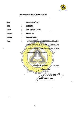 ARDITTA, ANOM (2003) ANALISIS PENGARUH PERSONAL SELLING TERHADAP VOLUME PENJUALAN PADA PT. KARYA ZIRANG UTAMA DAIHATSU JL. JEND. SUDIRMAN 182 SEMARANG. Other thesis, Prodi Manajemen Unika Soegijapranata.