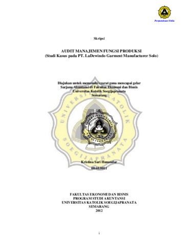 HUNANDAR, KRISTINA SARI (2012) AUDIT MANAJEMEN FUNGSI PRODUKSI (Studi Kasus pada PT. LaDewindo Garment Manufacturer Solo). Other thesis, Prodi Akuntansi Unika Soegijapranata.