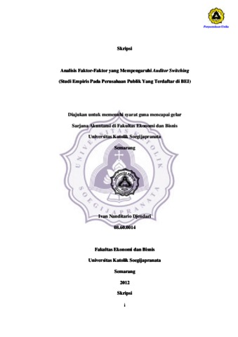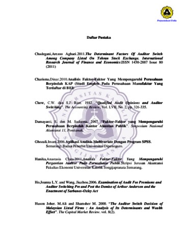 DJENDARI, IVAN NANDITARIO (2012) Analisis Faktor-Faktor yang Mempengaruhi Auditor Switching (Studi Empiris Pada Perusahaan Publik Yang Terdaftar di BEI). Other thesis, Prodi Akuntansi Unika Soegijapranata.