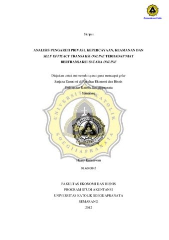 KURNIAWAN, HENRY (2012) ANALISIS PENGARUH PRIVASI, KEPERCAYAAN, KEAMANAN DAN SELF EFFICACY TRANSAKSI ONLINE TERHADAP NIAT BERTRANSAKSI SECARA ONLINE. Other thesis, Prodi Akuntansi Unika Soegijapranata.