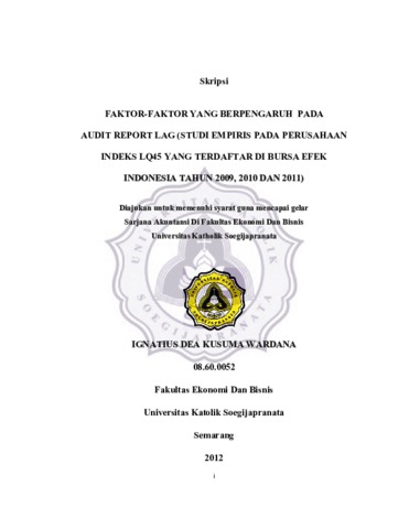 WARDANA, IGNATIUS DEA KUSUMA (2012) FAKTOR-FAKTOR YANG BERPENGARUH PADA AUDIT REPORT LAG (STUDI EMPIRIS PADA PERUSAHAAN INDEKS LQ45 YANG TERDAFTAR DI BURSA EFEK INDONESIA TAHUN 2009, 2010 DAN 2011). Other thesis, Prodi Akuntansi Unika Soegijapranata.