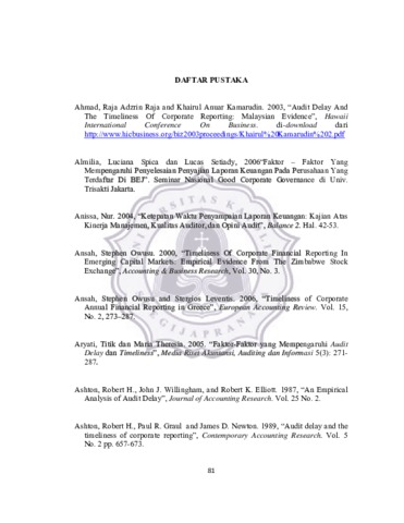 Perkembangan aktivitas di Bursa Efek Indonesia kini berkembang pesat dan berdampak pada peningkatan permintaan audit laporan keuangan secara efektif dan efisien. Setiap perusahaan yang go public diwajibkan untuk menyampaikan laporan keuangan yang disusun sesuai dengan standar akuntansi keuangan dan telah diaudit oleh akuntan publik yang terdaftar di Badan Pengawas Pasar Modal. Penelitian ini bertujuan untuk mengetahui faktor-faktor yag mempengaruhi audit delay. Populasi dalam penelitian ini yaitu perusahaan yang terdaftar pada indeks LQ45 di Bursa Efek Indonesia pada tahun 2009, 2010 dan 2011. Sampel dipilih dengan menggunakan purposive sampling dengan total sampel 114 data. Penelitian ini menggunakan data sekunder yaitu berupa annual report yang diperoleh dari website masing-masing perusahaan dan www.idx.co.id. Data yang diperoleh dianalisis menggunakan uji regresi linear berganda. Hasil penelitian membuktikan bahwa solvabilitas, likuiditas, ukuran perusahaan serta subsidiary berpengaruh secara signifikan terhadap audit report lag dan memiliki tanda sesuai dengan hipotesis yang diajukan.