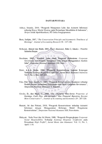 PRASTIKA, DIAS CHRISTIA (2012) ANALISIS PERBEDAAN EARNINGS RESPONSE COEFFICIENT UNTUK KELOMPOK PERUSAHAAN KONSERVATIF DAN OPTIMIS. Other thesis, Prodi Akuntansi Unika Soegijapranata.