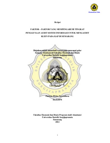 NAVRATILOVA, PATRICIA ELVIRA (2012) FAKTOR – FAKTOR YANG MEMPENGARUHI TINGKAT PENGGUNAAN AUDIT SISTEM INFORMASI UNTUK MENGAUDIT KLIEN PADA KAP DI SEMARANG. Other thesis, Prodi Akuntansi Unika Soegijapranata.