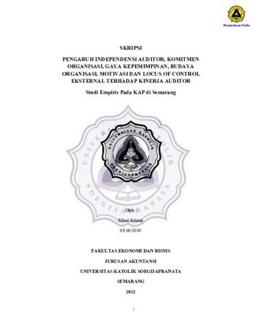 JOHANA, MIMI (2012) PENGARUH INDEPENDENSI AUDITOR, KOMITMEN ORGANISASI, GAYA KEPEMIMPINAN, BUDAYA ORGANISASI, MOTIVASI DAN LOCUS OF CONTROL EKSTERNAL TERHADAP KINERJA AUDITOR STUDI PADA EMPIRIS PADA KAP DI SEMARANG. Other thesis, Prodi Akuntansi Unika Soegijapranata.