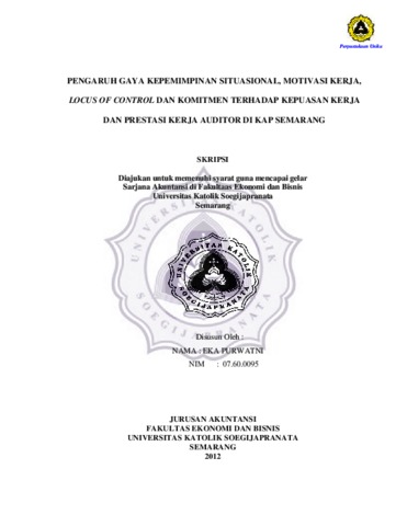 PURWATNI, EKA (2012) PENGARUH GAYA KEPEMIMPINAN SITUASIONAL, MOTIVASI KERJA, LOCUS OF CONTROL DAN KOMITMEN TERHADAP KEPUASAN KERJA DAN PRESTASI KERJA AUDITOR DI KAP SEMARANG. Other thesis, Prodi Akuntansi Unika Soegijapranata.