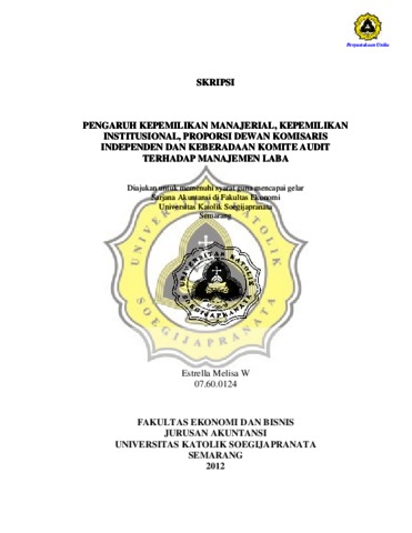 Melisa, Estrella (2012) PENGARUH KEPEMILIKAN MANAJERIAL, KEPEMILIKAN INSTITUSIONAL, PROPORSI DEWAN KOMISARIS INDEPENDEN DAN KEBERADAAN KOMITE AUDIT TERHADAP MANAJEMEN LABA. Other thesis, Prodi Akuntansi Unika Soegijapranata.