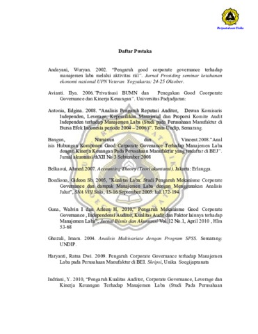 Penelitian ini bertujuan untuk mengetahui pengaruh kepemilikan manajerial,kepemilikan institusional,proporsi dewan komisaris independen dan Keberadaan komite audit terhadap manajemen laba. Penelitian ini dilakukan dengan metode dokumentasi dengan menggunakan data www.idx.com Populasi dalam penelitian ini adalah semua perusahaan yang go public di BEI pada tahun 2008-2010, sedangkan sampel dalam penelitian ini menggunakan perusahaan manufaktur yang berjumlah 132 perusahaan. Untuk memperoleh hasil, penelitian ini menggunakan alat analisis uji regresi linear berganda. Penelitian ini menggunakan modified jones model untuk menghitung discretionary accrual sebagai ukuran manajemen laba. Hasil penelitian ini menemukan bahwa : kepemilikan manajerial dan keberadaan komite audit berpengaruh positif dan tidak signifikan terhadap manajemen laba. Kepemilikan institusional dan proporsi dewan komisaris independen berpengaruh negative dan secara statistik signifikan terhadap manajemen laba Keywords : manajemen laba, kepemilikan manajerial, kepemilikan institusional dewan komisaris independen, komite audit