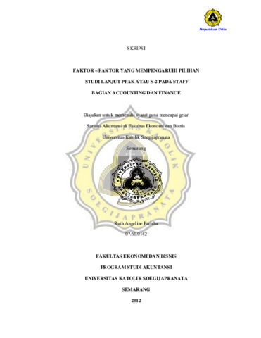 Parisha, Ruth Angeline (2012) FAKTOR – FAKTOR YANG MEMPENGARUHI PILIHAN STUDI LANJUT PPAK ATAU S-2 PADA STAFF BAGIAN ACCOUNTING DAN FINANCE. Other thesis, Prodi Akuntansi Unika Soegijapranata.