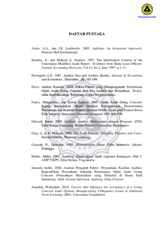 Siska, Dwi (2013) PENGARUH KUALITAS AUDITOR, OPINI AUDIT TAHUN SEBELUMNYA, PERTUMBUHAN PERUSAHAAN, RASIO LIKUIDITAS, RASIO PROFITABILITAS TERHADAP OPINI AUDIT GOING CONCERN (STUDI EMPIRIS PADA PERUSAHAAN DI BEI). Other thesis, Prodi Akuntansi Unika Soegijapranata.