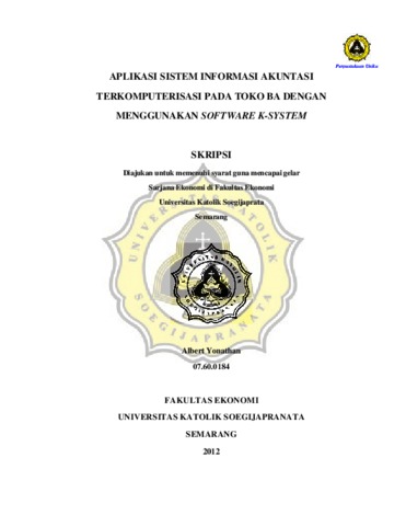 Yonathan, Albert (2012) APLIKASI SISTEM INFORMASI AKUNTASI TERKOMPUTERISASI PADA TOKO BA DENGAN MENGGUNAKAN SOFTWARE K-SYSTEM. Other thesis, Prodi Akuntansi Unika Soegijapranata.