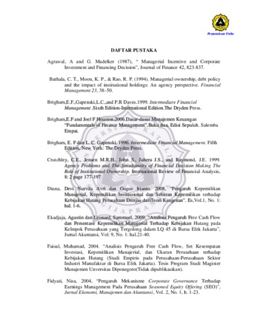 Penelitian ini bertujuan menunjukkan adanya pengaruh Pengaruh Struktur Kepemilikan Manajerial, Kepemilikan Institusional, Free Cash Flow, dan Investment Opportunity Set Terhadap Kebijakan Hutang. Populasi penelitian ini adalah perusahaan manufaktur yang terdaftar di Bursa Efek Indonesia (BEI) mulai dari tahun 2008 sampai dengan tahun 2010. Pengambilan sampel dalam penelitian ini menggunakan metode purposive random sampling. Sampel yang didapatkan dari penelitian ini yaitu total 142 perusahaan. Pengujian hipotesis dilakukan dengan regresi linear. Temuan dalam penelitian ini adalah : Pertama, Kepemilikan manajerial berpengaruh negatif dan signifikan terhadap kebijakan hutang. Kedua, Kepemilikan institusional berpengaruh negatif dan signifikan terhadap kebijakan hutang. Ketiga, Free cash flow berpengaruh positif dan signifikan terhadap kebijakan hutang. Keempat, Investment opportunity set berpengaruh positif dan signifikan terhadap kebijakan hutang. Kata Kunci : Kepemilikan manajerial, Kepemilikan Institusional, Free Cash Flow, Investment Opportunity Set, Kebijakan Hutang