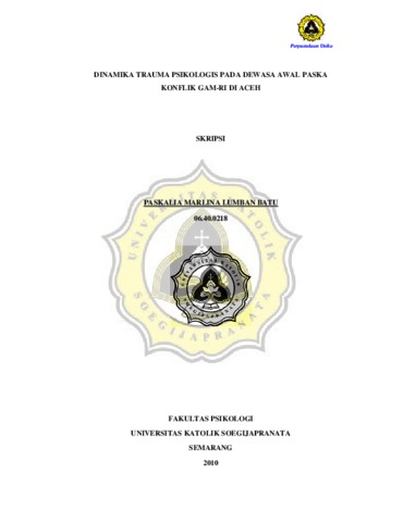 BATU, PASKALIA MARLINA LUMBAN (2010) DINAMIKA TRAUMA PSIKOLOGIS PADA DEWASA AWAL PASKA KONFLIK GAM-RI DI ACEH. Other thesis, Prodi Psikologi Unika Soegijapranata Semarang.