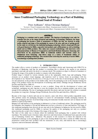 ARDHIANTO, PETER and Hardjana, Alfons Christian (2016) Smes Traditional Packaging Technology as a Part of Building Brand Soul of Product. International Journal of Computational Engineering Research (IJCER), 06 (07). pp. 10-15. ISSN 2250 – 3005