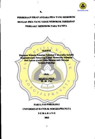 SELVIYAWAN, - (2003) PERBEDAAN SIKAP ANTARA PRIA YANG MEROKOK DENGAN PRIA YANG TIDAK MEROKOK TERHADAP PERILAKU MEROKOK PADA WANITA. Other thesis, Prodi Psikologi Unika Soegijapranata.
