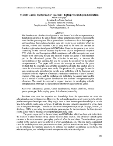Sanjaya, Ridwan and Soekesi, Eva and Sitohang, Posmaria (2015) Mobile Games Platforms for Teachers’ Entrepreneurship in Education. In: International Conference on Teaching and Learning 2015, 27-28 October 2015, Chulalongkorn University, Bangkok, Thailand.