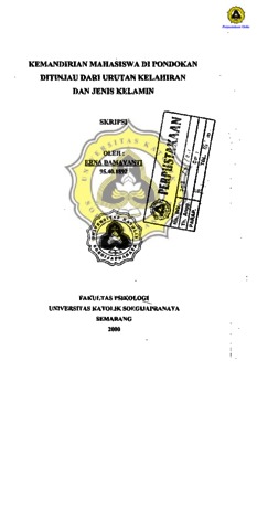 DAMAYANTI, ERNA (2000) KEMANDIRIAN MAHASISWA DI PONDOKAN DITINJAU DARI URUTAN KELAHIRAN DAN JENIS KELAMIN. Other thesis, Prodi Psikologi Unika Soegijapranata Semarang.