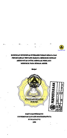SANTHIHARINI, WIDURI (1999) HUBUNGAN INTENSITAS INTERAKSI TEMAN SEBAYA DAN PENGETAHUAN TENTANG BAHAYA MEROKOK DENGAN ASERTIVITAS UNTUK MENOLAK PERILAKU MEROKOK PADA REMAJA AKHIR. Other thesis, Prodi Psikologi Unika Soegijapranata Semarang.