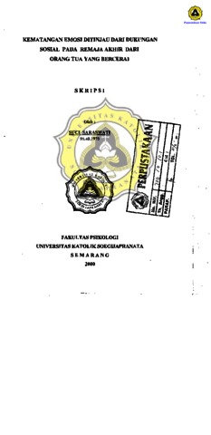 SARASWATI, SUCI (2009) KEMATANGAN EMOSI DITINJAU DARI DUKUNGAN SOSIAL PADA REMAJA AKHIR DARI ORANG TUA YANG BERCERAI. Other thesis, Prodi Psikologi Unika Soegijapranata Semarang.