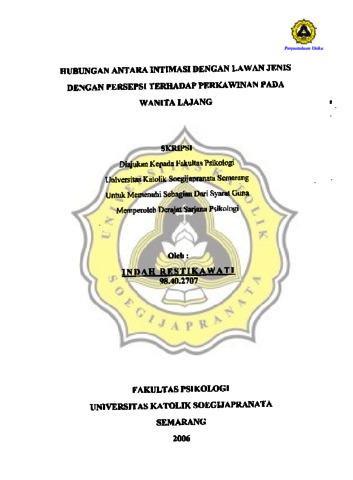 RESTIKAWATI, INDAH (2006) HUBUNGAN ANTARA INTIMASI DENGAN LAWAN JENIS DENGAN PRESEPSI TERHADAP PERKAWINAN PADA WANITA LAJANG. Other thesis, Prodi Psikologi Unika Soegijapranata Semarang.