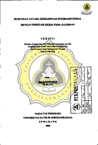 WINDARTI, DIAH (2003) HUBUNGAN ANTARA KEMAMPUAN INTERAKSI SOSIAL DENGAN PRESTASI KERJA PADA SALESMAN. Other thesis, Prodi Psikologi Unika Soegijapranata Semarang.