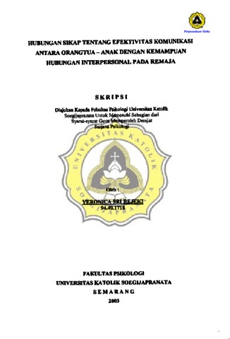 REJEKI, VERONICA SRI (2003) HUBUNGAN SIKAP TENTANG EFEKTIVITAS KOMUNIKASI ANTARA ORANG TUA-ANAK DENGAN KEMAMPUAN HUBUNGAN INTERPERSONAL PADA REMAJA. Other thesis, Prodi Psikologi Unika Soegijapranata.
