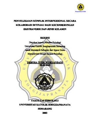 WURYANDANI, DEBORA TITIK (2003) PENYELESAIAN KONFLIK INTERPERSONAL SECARA KOLABORASI DITINJAU DARI KECENDERUNGAN EKSTRAVERSI DAN JENIS KELAMIN. Other thesis, Prodi Psikologi Unika Soegijapranata Semarang.