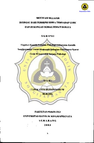 PUJIANINGRUM, TIPUK ETTY (2003) MOTIVASI BELAJAR DITINJAU DARI PERSEPSI SISWA TERHADAP GURU DAN DUKUNGAN SOSIAL TEMAN SEBAYA. Other thesis, Prodi Psikologi Unika Soegijapranata Semarang.