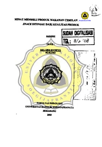 SUCIPTO, BELLINE (2003) MINAT MEMBELI PRODUK MAKANAN CEMILAN SNACK DITINJAU DARI KUALITAS PRODUK. Other thesis, Prodi Psikologi Unika Soegijapranata Semarang.
