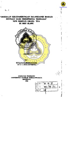 MUMPUNINGSIH, SETYAWATI (1996) PERBEDAAN KECENDERUNGAN DELINKUENSI REMAJA DITINJAU DARI PERSEPSINYA TERHADAP TIPE DISIPLIN ORANG TUA DI SMU SLAWI. Other thesis, Prodi Psikologi Unika Soegijapranata.