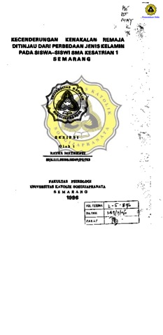 MAYAWATI, RATNA (1996) KECENDERUNGAN KENAKALAN REMAJA DITINJAU DARI PERBEDAAN JENIS KELAMIN PADA SISWA-SISWI SMA KESATRIAN 1 SEMARANG. Other thesis, Prodi Psikologi Unika Soegijapranata Semarang.