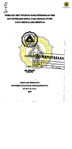 SUSANTI, IIN (1999) PERILAKU DIET DITINJAU DARI PENERIMAAN DIRI DAN INTERAKSI SOSIAL PARA REMAJA PUTRI YANG MENGALAMI OBESITAS. Other thesis, Prodi Psikologi Unika Soegijapranata.