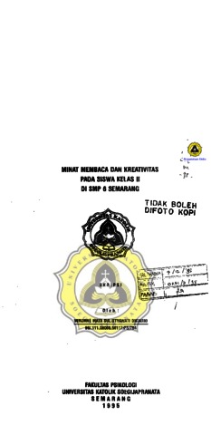 ONTARIO, VERONNE MAYA SULISTYAWATI (1995) MINAT MEMBACA DAN KREATIVITAS PADA SISWA KELAS II DI SMP 6 SEMARANG. Other thesis, Prodi Psikologi Unika Soegijapranata Semarang.