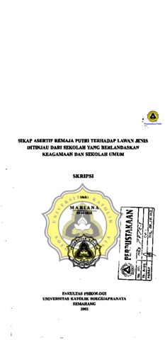 MARIANA, - (2002) SIKAP ASERTIF REMAJA PUTRI TERHADAP LAWAN JENIS DITINJAU DARI SEKOLAH YANG BERLANDASKAN KEAGAMAAN DAN SEKOLAH UMUM. Other thesis, Prodi Psikologi Unika Soegijapranata Semarang.