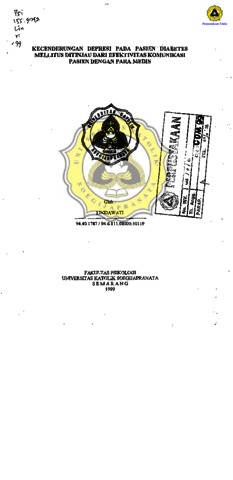 LINDAWATI, - (1999) KECENDERUNGAN DEPRESI PADA PASIEN DIABETES MILITUS DITINJAU DARI EFEKTIVITAS KOMUNIKASI PASIEN DENGAN PARA MEDIS. Other thesis, Prodi Psikologi Unika Soegijapranata.