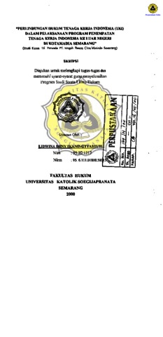 IKANINGTYASTUTI, LIDWINA DENY (2000) PERLINDUNGAN HUKUM TENAGA KERJA INDONESIA (TKI) DALAM PELAKANAAN PROGRAM PENEMPATAN TENAGA KERJA INDONESIA KE LUAR NEGERI DI KOTAMADIA SEMARANG (Studi kasus di Perwada PT. Megah Baana Citra Masindo Semarang). Other thesis, Prodi Hukum Universitas Katolik Soegijapranata.