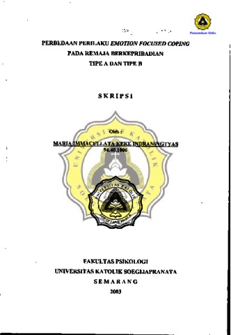 INDRANINGTYAS, MARIA IMMACULLATA KEKE (2003) PERBEDAAN PERILAKU EMOTION FOCUSED COPING PADA REMAJA BERKEPRIBADIAN TIPE A DAN TIPE B. Other thesis, Prodi Psikologi Unika Soegijapranata.