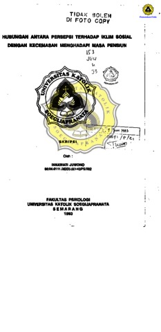 JUWONO, INNAWATI (1993) HUBUNGAN ANTARA PERSEPSI TERHADAP IKLIM SOSIAL DENGAN KECEMASAN MENGHADAPI MASA PENSIUN. Other thesis, Prodi Psikologi Unika Soegijapranata.