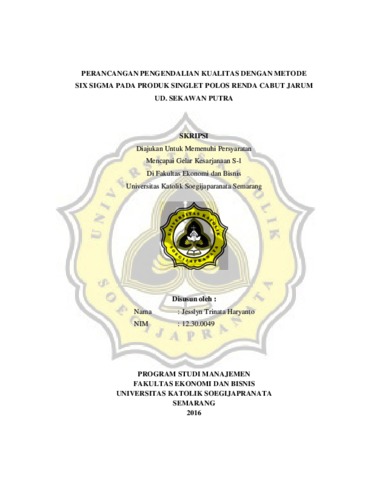 HARYANTO, JESSLYN TRINATA (2016) PERANCANGAN PENGENDALIAN KUALITAS DENGAN METODE SIX SIGMA PADA PRODUK SINGLET POLOS RENDA CABUT JARUM UD. SEKAWAN PUTRA. Other thesis, Prodi Manajemen Unika Soegijapranata.