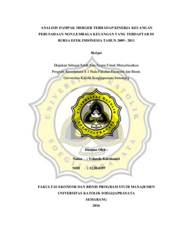KURNIASARI, YOLANDA (2016) ANALISIS DAMPAK MERGER TERHADAP KINERJA KEUANGAN PERUSAHAAN NON LEMBAGA KEUANGAN YANG TERDAFTAR DI BURSA EFEK INDONESIA TAHUN 2009 - 2011. Other thesis, Prodi Manajemen Unika Soegijapranata.