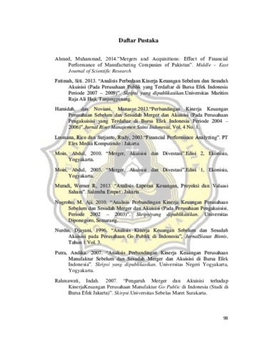 Penelitian ini bertujuan untuk mengetahui dan memperoleh bukti empiris kinerja keuangan perusahaan sebelum dan sesudah merger pada perusahaan non lembaga keuangan yang terdaftar di BEI. Teknik analisis data dalam penelitian ini menggunakan uji parametrik yaitu Paired Sample T - test. Hasil penelitian dengan menggunakan rasio profitabilitas, leverage, aktivitas, pasar, likuiditas, menunjukkan bahwa tidak terdapat perbedaan kinerja keuangan antara sebelum dan sesudah merger.