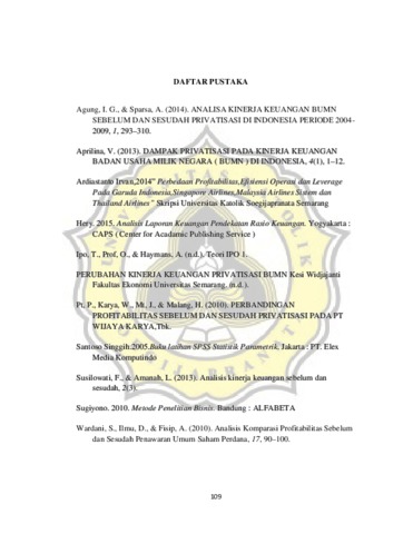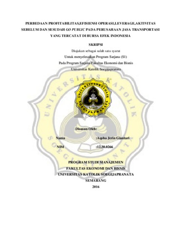 GIANTARI, AQSHA JERIN (2016) PERBEDAAN PROFITABILITAS,EFISIENSI OPERASI,LEVERAGE,AKTIVITAS SEBELUM DAN SESUDAH GO PUBLIC PADA PERUSAHAAN JASA TRANSPORTASI YANG TERCATAT DI BURSA EFEK INDONESIA. Other thesis, Prodi Manajemen Unika Soegijapranata.