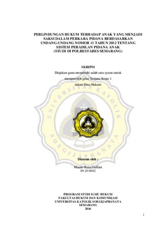 Gulfara, Mastio Rosa (2016) PERLINDUNGAN HUKUM TERHADAP ANAK YANG MENJADI SAKSI DALAM PERKARA PIDANA BERDASARKAN UNDANG-UNDANG NOMOR 11 TAHUN 2012 TENTANG SISTEM PERADILAN PIDANA ANAK (STUDI DI POLRESTABES SEMARANG). Other thesis, PROGDI ILMU HUKUM UNIKA SOEGIJAPRANATA.