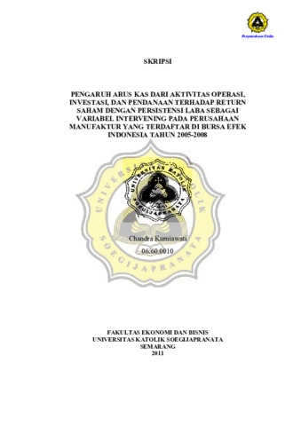 KURNIAWATI, CHANDRA (2011) PENGARUH ARUS KAS DARI AKTIVITAS OPERASI,INVESTASI,DAN PENDANAAN TERHADAP RETURN SAHAM DENGAN PERSISTENSI LABA SEBAGAI VARIABEL INTERVENING PADA PERUSAHAAN MANUFAKTUR YANG TERDAFTAR DI BURSA EFEK INDONESIA TAHUN 2005-2008. Other thesis, Prodi Akuntansi Unika Soegijapranata.